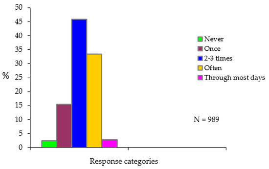 Inductees’ personal wellbeing and recollections of OA residential experiences, three months following the programme, were represented through a number of single response questions. Figure 4 illustrates that four out of every five inductees had frequent recollections (ranging from ‘2 to 3 times’ to ‘through most days’) of the OA programme. Less than 2 in 100 students had never thought about their OA residential experiences since the completion of the programme. This pattern of responses was evident for males and females.