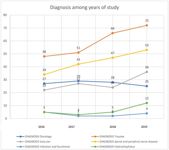 Figure 1 represents the trend of the total number of admitted patients each year with the corresponding diagnostic category. As seen in the graph, trauma cases were continuously raising during the study years with the highest number of cases in 2019. Spinal and peripheral nerve cases showed a steady growth between the study years, as well as the hydrocephalus, infection, and functional cases, but to a lesser extent. Oncology and vascular cases showed a fluctuating pattern among the study years.