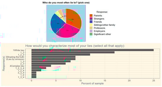 Who did our study sample most often lie to and how did they characterize their lies? The complete response options to the question “How would you characterize most of your lies? (select all that apply)” were as follows: 1. White lies (harmless or trivial lies); 2. Lies by omission (leaving out the truth); 3. Shading the truth (leaving out or concealing part of the truth); 4. Complex lies (relating to your identity, accomplishment, or merit). 1_2 White lies (harmless or trivial lies); Lies by omission (leaving out the truth). 1_3: White lies (harmless or trivial lies); Shading the truth (Leaving out or concealing part of the truth) 1_4: White lies (harmless or trivial lies); Complex lies (relating to your identity, accomplishment, or merit). 2_3: Lies by omission (leaving out the truth); Shading the truth (leaving out or concealing part of the truth). 1_2_3: White lies (harmless or trivial lies); Lies by omission (leaving out the truth); Shading the truth (leaving out or concealing part of the truth). 1_2_4: White lies (harmless or trivial lies); Lies by omission (leaving out the truth); Complex lies (relating to your identity, accomplishment, or merit). 1_3_4: White lies (harmless or trivial lies); Shading the truth (Leaving out or concealing part of the truth); Complex lies (relating to your identity, accomplishment, or merit). 2_3_4: Lies by omission (leaving out the truth); Shading the truth (leaving out or concealing part of the truth); Complex lies (relating to your identity, accomplishment, or merit). 1_2_3_4: White lies (harmless or trivial lies); Lies by omission (leaving out the truth); Shading the truth (leaving out or concealing part of the truth); Complex lies (relating to your identity, accomplishment, or merit).