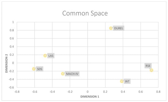 The multidimensional scale separated the scores for these six psychometric tests into three discernible groups (Figure 2). A normalized raw stress value of 0.00139 indicated good fit within our two-dimensional scale as this value was close to zero [49]. Scores on the DUREL were highly distinct from those of the other study variables; hence the DUREL was positioned by itself. There was similarity between the scores of the IAT and the RSE and closer similarity between the scores of the SDS, LAS and MACH-IV. The strongest correlation (either positive or negative) was between total scores on the LAS and the MACH-IV (see Table 1). Figure 2 confirmed that the strongest associations were across three of the six psychometric tests (SDS, LAS, MACH-IV). Distinctions between these tests and their internal consistency were corroborated by increasing Cronbach’s Alpha values when the DUREL and then the DUREL, IAT, and RSE were omitted from a reliability analysis ([1] SDS, LAS, MACH-IV, IAT, RSE, DUREL; Cronbach’s Alpha value = 0.134; [2] SDS, LAS, MACH-IV, IAT, RSE; Cronbach’s Alpha value = 0.514; [3] SDS, LAS, MACH-IV; Cronbach’s Alpha value = 0.673). Less than 33% of variance between the SDS, LAS, and MACH-IV was random which suggests an acceptable level of reliability [51].