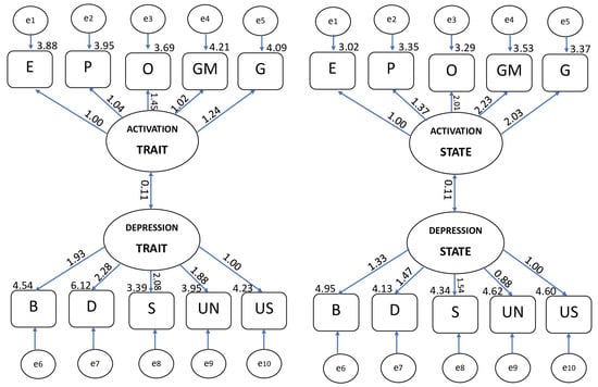 The models in the trait format, especially CFI and RMSEA obtained for Model 3, indicated a good fit to the data compared to the other models. Model 2 showed an adequate fit for both RMSEA and CFI, but not a good a fit as Model 3. Likewise, the highest TLI values were for Model 3 (TLI = 0.93), which were especially good. Finally, Model 3 presented the lowest values for AIC (120.31). Thus, only Model 3 in the state format was calculated. All the statistics showed a good fit, and were even better than Model 3 in the trait format.