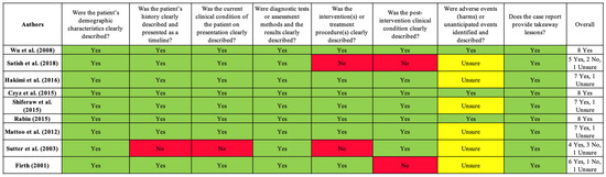 The Joanna Briggs Institute (JBI) Critical Appraisal Checklist for Case Reports was used to conduct a rigorous quality assessment of the included studies after the screening process [10]. The checklist consists of eight different items and an overall judgement on the strength of the study (Figure 2). The quality assessment was independently completed by MD and TR, and all conflicts were resolved by a third independent reviewer, CO.