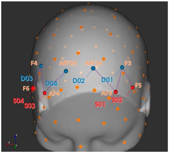 A total of 8 optodes belonging to a NIRScout system (NIRx Medical Technologies, LLC, Los Angeles, CA, USA) were employed to capture hemodynamic signals, specifically variations in oxygenated hemoglobin (O2Hb) and deoxygenated hemoglobin (HHb) concentrations. These optodes consisted of four light sources and four detectors, positioned on the scalp using an fNIRS cap following the international standard system 10/5 [39]. The emitter–detector distance was standardized at 30mm for consecutive optodes, and a near-infrared light with wavelengths of 760 and 850 nm was utilized. A six channels matrix was arranged to cover the left, and right PFC as reported in Figure 2 [30,40].