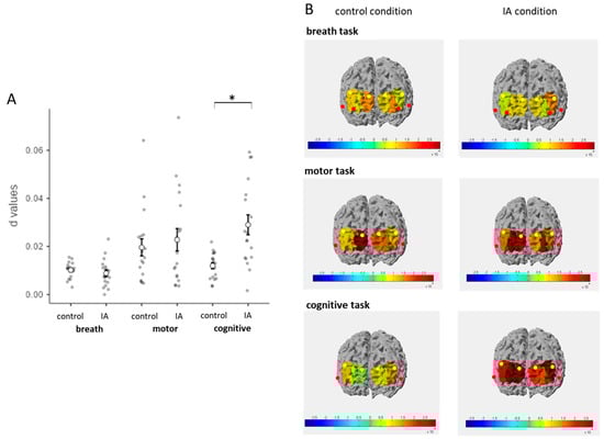 Hemodynamic O2Hb results for Condition × Task. (A) The plot shows the significant interaction effect Condition × Task detected for the O2Hb values. (B) In the head renderings, the red color corresponds to the increase in O2Hb values for the control (left heads) versus the IA condition (right heads) for the breath, motor and cognitive synchronization tasks. In the plot, asterisk marks statistically significant differences with p ≤ 0.05.