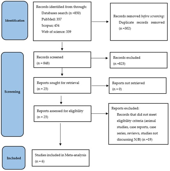 Our search strategy yielded a total of 848 research articles from the three databases. After title and abstract screening, 25 were eligible for further screening by full-text. The final number after this process was six articles [17,18,19,20,21,22] that entered the meta-analysis (Figure 1).