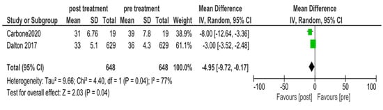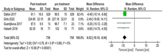 In addition, there was a statistically significant reduction in BMI after treatment compared to before treatment with MD: −4.95 (95%CI: −9.72–−0.17, p = 0.04), but with a significant heterogeneity (Figure 4).