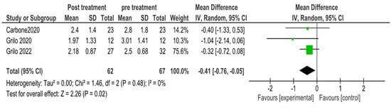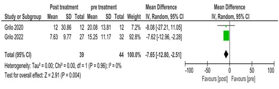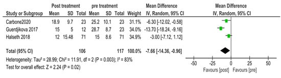 Moreover, there was a significant reduction in BES after treatment with MD: −7.66 (95%CI: −14.36–0.96, p = 0.02) with significant heterogeneity (Figure 5).