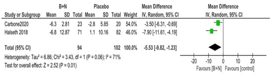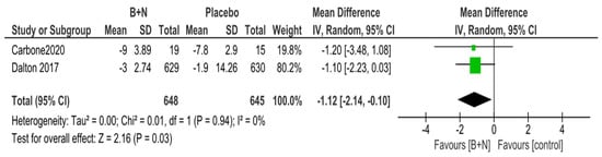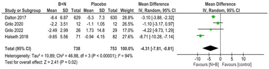 This study showed that the use of an NB combination is associated with a statistically significant reduction in the weight of the patients compared to their weight before treatment with MD: −8.52 (95% CI: −10.01–−6.94, p < 0.00001) and with non-significant heterogeneity (Figure 3).