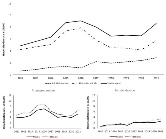 The number of hospitalizations for suicidal ideation consistently increased over the considered period, while hospitalizations for suicide attempts exhibited a notable rise from 2012 to 2016, followed by a decline from 2016 to 2020. In 2021, the rate of hospitalization for suicide attempts experienced an uptick, possibly attributed to social restrictions (such as social distancing and lockdowns), economic challenges, and difficulties in accessing services caused by the COVID-19 pandemic.