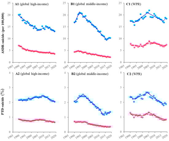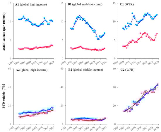Temporal fluctuations of ASDR-suicide and PTD-suicide of overall ages among global high-income, middle-income, and the WPR countries from 1990 to 2019. Temporal fluctuation of annual ASDR-suicide (upper side panels: (A1–C1)) and PTD-suicide (lower side panels: (A2–C2)) of overall ages among males (blue) and females (red) in high-income (A1,A2), middle-income (B1,B2), and the WPR (C1,C2) countries from 1990 to 2019 using joinpoint regression. Ordinates indicate the annual ASDR-suicide (per 100,000 population: (A1–C1)) or PTD-suicide (%: (A2–C2)). Abscissas indicate calendar years. Circles indicate the observed data. Solid and dotted lines indicate the significant and nonsignificant trends of ASDR-suicide and PTD-suicide detected by joinpoint regression, respectively.