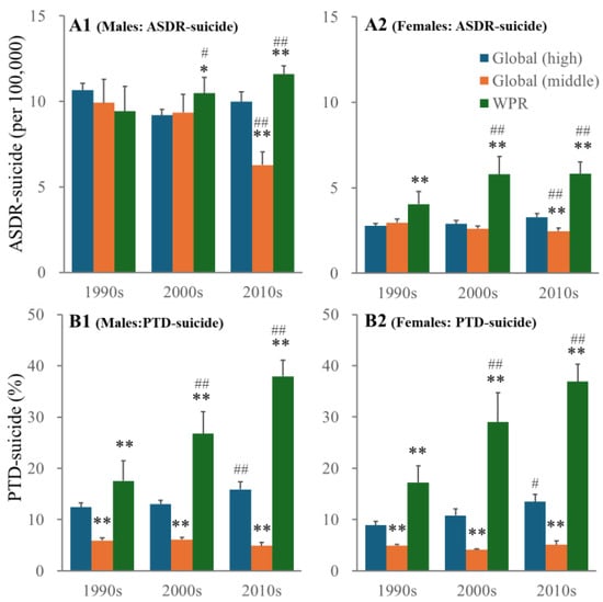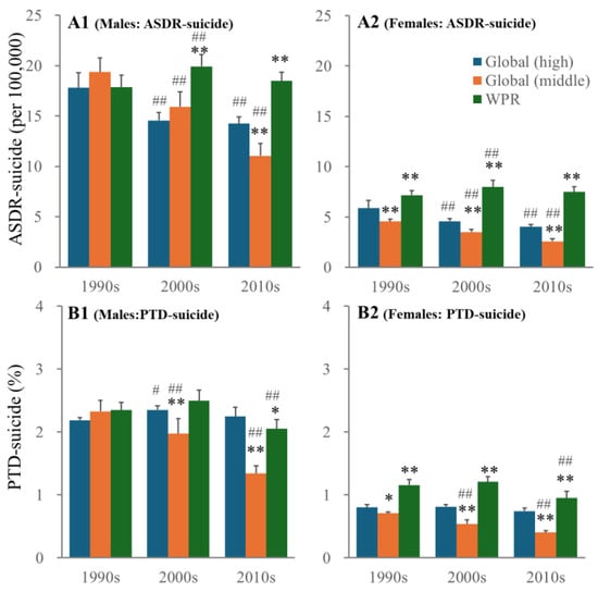 ASDR-suicide and PTD-suicide of overall ages among males and females in global high-income, middle-income, and WPR countries from 1990 to 2019. Upper side panels indicate ASDR-suicide of males (A1) and females (A2). Lower side panels indicate PTD-suicide of males (B1) and females (B2). * p < 0.05, ** p < 0.01 relative to high-income countries, # p < 0.05, ## p < 0.01 relative to 1990s by two-way analysis of variance (ANOVA) with Scheffe’s post hoc test. F-values of ASDR-suicide of males and females were [Fregion(2,89) = 75.3 (p < 0.01), Fyear(2,89) = 75.7 (p < 0.01), Fregion*year(4,89) = 42.0 (p < 0.01)] and [Fregion(2,89) = 49.4 (p < 0.01), Fyear(2,89) = 59.9 (p < 0.01), Fregion*year(4,89) = 24.3 (p < 0.01)], respectively. F-values of ASDR-suicide of males and females were [Fregion(2,89) = 73.6 (p < 0.01), Fyear(2,89) = 74.0 (p < 0.01), Fregion*year(4,89) = 33.8 (p < 0.01)] and [Fregion(2,89) = 74.1 (p < 0.01), Fyear(2,89) = 53.3 (p < 0.01), Fregion*year(4,89) = 15.2 (p < 0.01)], respectively.