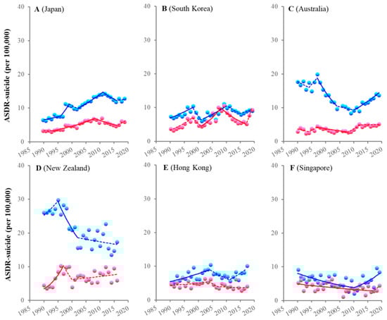 Temporal fluctuations of adolescent ASDR-suicide in the WPR countries from 1990 to 2019. Temporal fluctuation of annual ASDR-suicide among adolescent males (blue) and females (red) in six countries in the WPR, including Japan (A), South Korea (B), Australia (C), New Zealand (D), Hong Kong (E), and Singapore (F), from 1990 to 2019 using joinpoint regression. Ordinates indicate the annual ASDR-suicide (per 100,000 population). Abscissas indicate calendar years. Circles indicate the observed data. Solid and dotted lines indicate the significant and nonsignificant trends of ASDR-suicide detected by joinpoint regression, respectively.