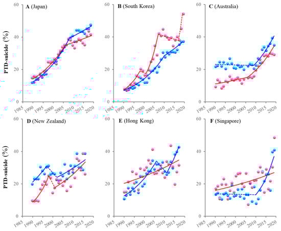 Temporal fluctuations of adolescent PTD-suicide in the WPR countries from 1990 to 2019. Temporal fluctuation of annual PTD-suicide among adolescent males (blue) and females (red) in six countries in the WPR, including Japan (A), South Korea (B), Australia (C), New Zealand (D), Hong Kong (E) and Singapore (F), from 1990 to 2019 using joinpoint regression. Ordinates indicate the annual PTD-suicide (%). Abscissas indicate calendar years. Circles indicate the observed data. Solid and dotted lines indicate the significant and nonsignificant trends of PTD-suicide detected by joinpoint regression, respectively.