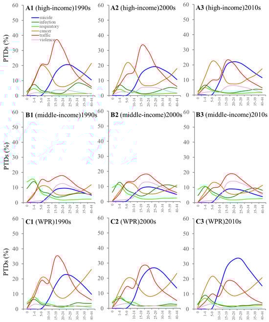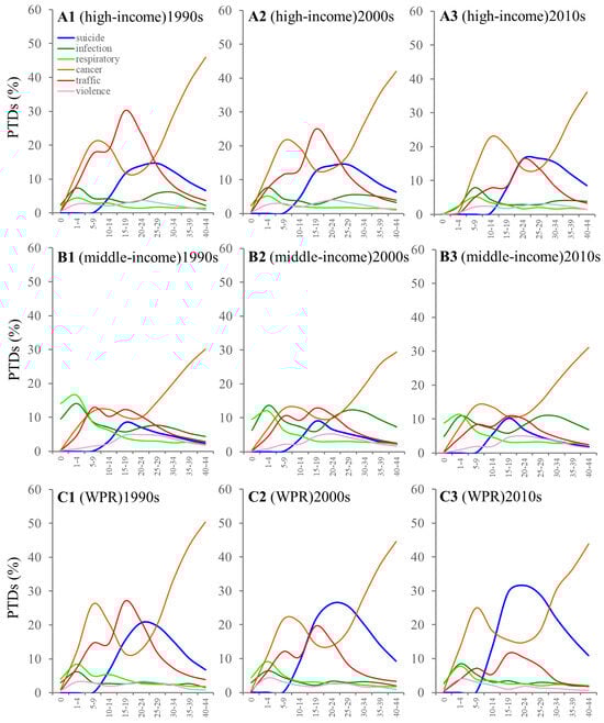 Age-dependent fluctuation of PTD of major causes of death among males in global high-income, middle-income, and WPR countries from 1990 to 2019. Age-dependent fluctuation of PTD of major causes of death, such as suicide (blue), infectious and parasitic diseases (green), respiratory infections (light green), malignant neoplasms (cancer: blown), road traffic accidents (red), and violence (pink) among males in high-income (A1–A3), middle-income (B1–B3), and WPR (C1–C3) countries in the 1990s ((A1,B1,C1): 1990–1999), 2000s ((A2,B2,C2): 2000–2009), and 2010s ((A3,B3,C3): 2010–2019). Ordinates and abscissas indicate PTD (%) and 5 interval ages, respectively.