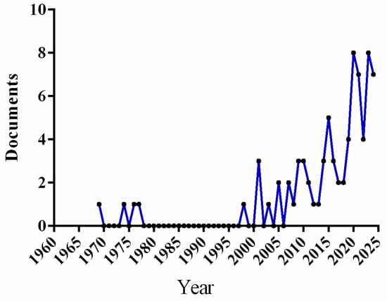 A total of 77 articles were found in the Scopus database and were published during the study period between 1969 and 2024, mostly articles (81.8%), reviews (5.2%), conference papers (3.9%), and book chapters (1.3%) (Figure 2). The findings revealed that the first document was published in 1969. The number of publications recorded in the Scopus database has progressively increased, with the exception of 1977 and 1997, which are characterized by 0 publications. Figure 3 provides robust evidence that the scientific community’s interest in this field of research has increased since 2007. This progression could be explained by the development of technology, a better understanding of the pathology, the development of a search for safer and effective medications, and the appearance of drug-resistant epilepsy.