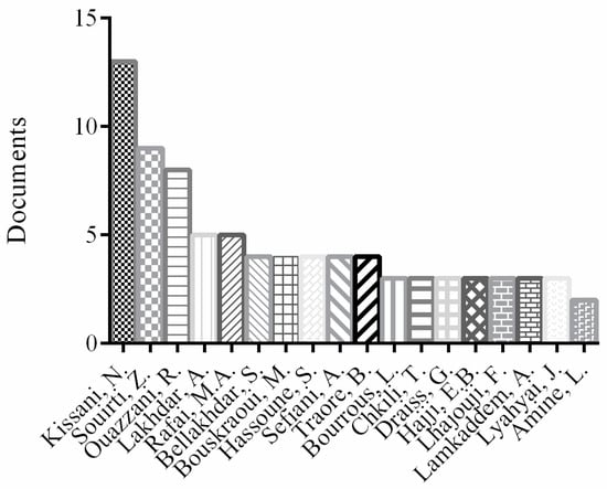 Based on the available data extracted from the Scopus database, the most contributing author was Kissani, N from University Hospital Mohamed VI, Marrakech, Morocco, with the highest article number of 11 articles and a total of 1646 citations. These findings demonstrate the paramount impact of the research conducted by Kissani, N on the scientific community, which marks their position as a leader in the field in Morocco. One of his most highly cited articles was “Telemedicine in epilepsy: How can we improve care, teaching, and awareness?” [21] with 59 citations, whereas his most recent publication was “Prevalence of epilepsy in Morocco: A population-based study” [22]. Souirti, Z and Ouazzani, R also significantly contributed to the enrichment of scientific databases on epilepsy, with eight and seven articles, respectively. Furthermore, other authors have participated deeply in the understanding of its pathology with variable article numbers, such as Lakhdar, A; Rafai, M.A; Bellakhder, S; Bouskraoui, M; and so on (Figure 4). More information about the authors’ publications during the study period is presented in Figure 4.