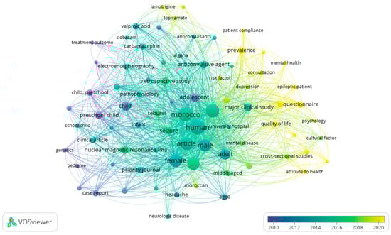 A bibliometric analysis of co-occurring keywords was performed using all keywords. The treatment of data extracted from Scopus revealed that 1306 keywords were identified. For network analysis, the selected keywords that occurred at least 5 times (78 keywords) were used (Figure 7). The keywords “Epilepsy” and “Morocco” were the most frequent keywords in the scheme for obvious reasons, as we limited our search to Morocco. Figure 7 shows different nodes representing an entity. The size of each entity denotes how frequently a keyword appears, and the co-occurrence of a keyword is represented by the association between different generated nodes. Four clusters of keywords with varying colors were produced by the bibliometric study (blue, green, and yellow). The green cluster consists of the main words centered on epilepsy, seizures, mental illness, and anticonvulsant agents. The yellow cluster comprises the most widely used keywords after 2020, including quality of life, epileptic patient, questionnaire, and mental health (Figure 7). Notably, there is a scarcity of keywords related to pharmacogenetics in epilepsy and drug-resistant epilepsy, which presents a potential opportunity for future growth and collaboration with international institutions.