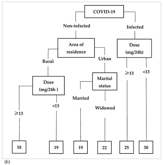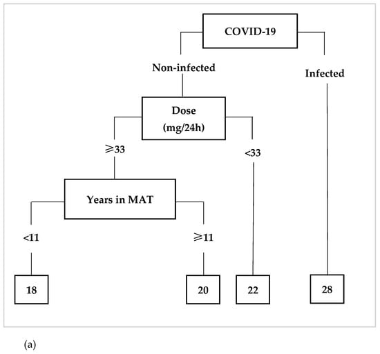 According to the regression tree for MMT patients (Figure 1a), the total craving score appears to be determined by COVID-19 infection, since the infected patients had the higher craving level (i.e., score equal to 28) in comparison to the non-infected. Among the latter, the dose of methadone is a determinant, as those who receive a dose lower than 33 mg/24 h have a higher level of craving (i.e., 22) than those who receive higher doses. For the patients of the second category, the number of years of attending MAT programs determines the total craving score, since the patients with less than 11 years have the lowest score (i.e., 18), which equates to a lower craving level.