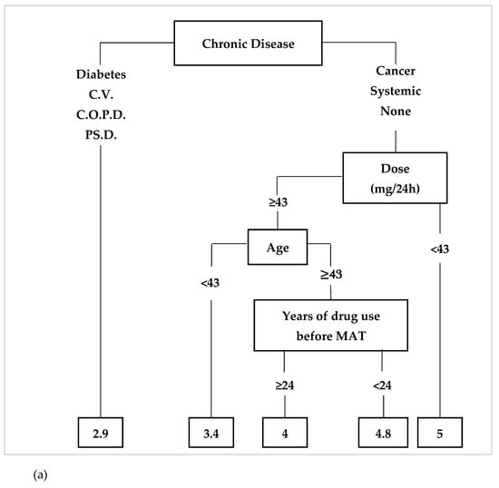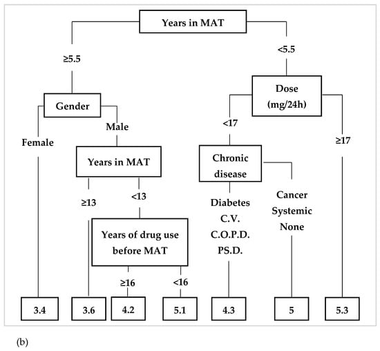 In regards to the regression tree for MMT patients (Figure 2a), chronic illness is the primary factor that determines QoL. The patients with diabetes, cardiovascular disease, or COPD have the lowest score (lowest QoL), whereas QoL of patients with other chronic illnesses (i.e., cancer or a systemic disease) or none depends on methadone dose. Thus, those who receive a methadone dose lower than 43 mg/24 h have the best QoL score (i.e., 5), whilst those who take methadone in a dose greater or equal to 43 mg/24 h, and are younger than 43 years of age, have a lower QoL score (i.e., 3.4) than their older counterparts. Among the patients who are 43 years old or older, the number of years of opioid use prior to their admission in MAT programs plays an important role in QoL. Indeed, MMT patients who used opioids for less than 24 years achieve a better QoL score (i.e., 4.8) compared to those who use opioids for more than 24 years (i.e., 4).