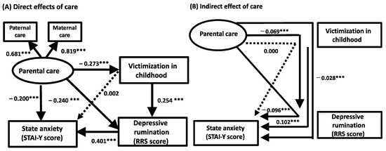 Results of the structural equation modeling with the parental attitude of ‘care’ experienced in childhood as the latent variable, and peer victimization in childhood, depressive rumination (RRS score), and state anxiety evaluated using the STAI-Y as the observed variables. The latent variable is shown as an oval, and the observed variables are shown as rectangles. The arrows with solid lines represent the statistically significant paths, and those with broken lines represent the nonsignificant paths. Direct effects (A) and indirect effects (B) between the variables are shown. In (B), the observed variables of paternal and maternal care have been omitted. The numbers show the standardized path coefficients. *** p < 0.001.