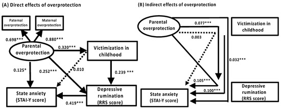 Results of the structural equation modeling with the parental attitude of ‘overprotection’ in childhood as the latent variable, peer victimization in childhood, depressive rumination (RRS score), and state anxiety evaluated using the STAI-Y as the observed variables. The latent variable is shown as an oval, and the observed variables are shown as rectangles. The arrows with solid lines represent the statistically significant paths, and those with broken lines represent the nonsignificant paths. Direct effects (A) and indirect effects (B) between the variables are shown. In (B), the observed variables of paternal and maternal overprotection have been omitted. The numbers show the standardized path coefficients. * p < 0.05, *** p < 0.001.