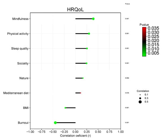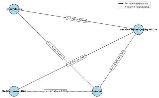 Correlations between burnout, mindfulness, Mediterranean diet, and HRQoL.