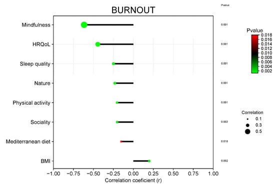 Apart from the negative correlation with Mindfulness, HRQoL, and the Mediterranean diet, the analysis revealed significant negative correlations between burnout and various components of the Mediterranean lifestyle, including sleep quality, proximity to nature, physical activity, and sociality. Specifically, higher levels of sleep quality were associated with lower levels of burnout (r = −0.45, p < 0.01), indicating that participants who reported better sleep quality experienced fewer symptoms of burnout. Similarly, proximity to nature was inversely correlated with burnout (r = −0.38, p < 0.01). This suggests that individuals who had more frequent access to natural environments reported lower burnout levels. Physical activity also showed a significant negative correlation with burnout (r = −0.42, p < 0.01). Participants engaging in regular physical activity reported less burnout, underscoring the protective role of exercise against stress and exhaustion. Lastly, sociality was found to be negatively correlated with burnout (r = −0.40, p < 0.01). Higher levels of social interaction and support were associated with reduced burnout symptoms, highlighting the importance of social connections in mitigating burnout (Figure 3).