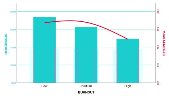 A one-way analysis of variance (ANOVA) was performed to assess the impact of burnout levels (low, medium and high) on mindfulness (MAAS-15 scores) and adherence to the Mediterranean diet (MEDAS-14 scores). For mindfulness (MAAS-15), the results indicated a statistically significant effect of burnout levels on mindfulness scores (p < 0.05). This suggests that burnout levels had a significant impact on participants’ mindfulness scores. Similarly, for adherence to the Mediterranean diet (MEDAS-14), a one-way ANOVA also revealed a statistically significant effect of burnout levels (p < 0.05). This indicates that burnout levels significantly influenced adherence to the Mediterranean diet (Figure 4).