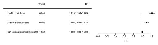 A multinomial logistic regression analysis was performed to examine the association between burnout levels (low, medium, and high) and mindfulness as the outcome variable. Odds ratios (ORs) and p-values are presented for each burnout level, with the high burnout group used as the reference category. For the low burnout score, there was a statistically significant association with mindfulness, with an odds ratio of 1.216 (95% CI: 1.153–1.283, p = 0.001). This indicates that participants with low burnout were significantly more likely to report higher mindfulness levels compared to those with high burnout. Similarly, the medium burnout score was also significantly associated with mindfulness, with an odds ratio of 1.098 (95% CI: 1.059–1.138, p = 0.002). This suggests that individuals with medium burnout were more likely to exhibit higher mindfulness than those in the high burnout group. As the reference category, the high burnout score showed an odds ratio of 1.000 (95% CI: 1.000–1.000, p = 1.000), indicating no difference in mindfulness within this group (Figure 5).