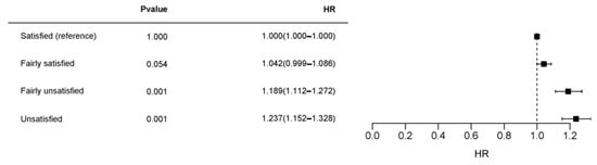 After conducting a multinomial logistic regression analysis, this figure illustrates the hazard ratios (HRs) for burnout associated with varying levels of job satisfaction, with “Satisfied” as the reference category. The analysis reveals that individuals who are “Fairly unsatisfied” (HR = 1.189, p = 0.001) and “Unsatisfied” (HR = 1.237, p = 0.001) face significantly elevated risks of burnout compared to those in the satisfied group. Meanwhile, the “Fairly satisfied” group shows a non-significant increase in burnout risk (HR = 1.042, p = 0.054). These results underscore the protective role of job satisfaction in mitigating burnout, with lower satisfaction levels correlating with a heightened burnout risk (Figure 6).