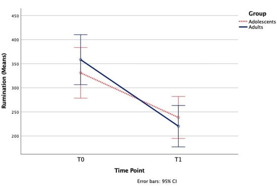 There was a significant main effect of time on rumination (F(1,75) = 52.54, p < 0.001, ηp2 = 0.41), suggesting a change in rumination from T0 to T1 for the whole sample. As illustrated in Figure 1, rumination decreased from T0 (adolescents mean = 331.05; SD = 180.11; 95%CI = 271.85 to 390.25; adults mean = 358.44; SD = 143.71; 95%CI = 311.85 to 405.02) to T1 (adolescents mean = 238.50; SD = 141.77; 95%CI = 191.90 to 285.10; adults mean = 220.44; SD = 127.84; 95%CI = 178.99 to 261.88). There was no significant group x time interaction (F(1,75) = 2.04, p = 0.157, ηp2 = 0.03), which suggests that there was no difference between the age groups in the size of the reduction in depressogenic rumination from T0 to T1.