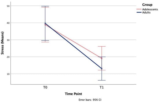 There was a significant main effect of time on stress (F(1,75) = 57.58, p < 0.001, ηp2 = 0.43), suggesting a change in stress over time in the whole sample. There was no significant group x time interaction (F(1,75) = 1.27, p = 0.264, ηp2 = 0.02). As shown in Figure 2, stress decreased from T0 (adolescents mean = 38.87; SD = 31.92; 95%CI = 28.38 to 49.36; adults mean = 39.69; SD = 31.22; 95%CI = 29.57 to 49.81) to T1 (adolescents mean = 19.13; SD = 25.04; 95%CI = 10.90 to 27.36; adults mean = 13.08; SD = 17.65; 95%CI = 7.36 to 18.80), which shows that the decrease in stress over time was not significantly different for the two age groups.