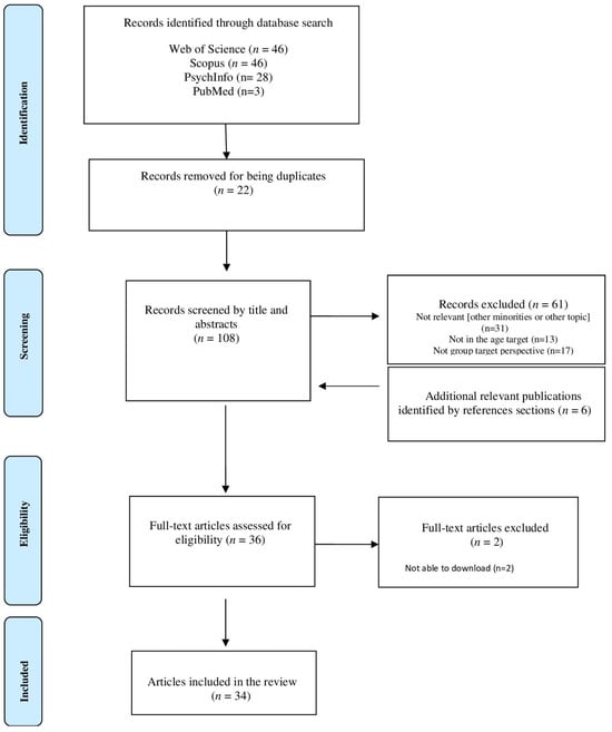 We selected these databases for their comprehensive coverage of multidisciplinary studies, including psychology, social sciences, and health sciences, which were key areas for our review. These databases provided access to a wide range of peer-reviewed articles relevant to the intersection of autism, sexuality, and intimacy. The reference sections of the included articles were reviewed for additional relevant publications that may have been missed. After an initial search of each database, a total of 130 potential records were identified and exported to Zotero, and 22 sources were eliminated as duplicates. The titles and abstracts of the remaining 108 articles were screened. The search results are presented in a flow chart (see Figure 1). See File S1 for the Search Strategy.