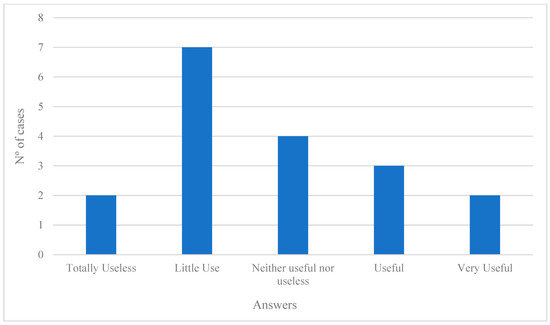 Figure 4). Firstly, the question “How do you rate the treatment in the Borderline Personality Disorder Intervention Program that you attended, in terms of its usefulness?” was asked, and it was possible to see that, in a similar vein to the responses shown above, the majority of the subjects found the program to be of little or no use (neither useful nor useless + not very useful + totally useless; n = 13; 72.2%), although of these participants, only two considered it to be totally useless (11.1%). On the other hand, five participants considered the program to have been of some use in their case (useful + very useful; 27.8%).