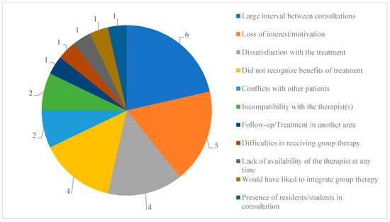 With regard to the reasons mentioned for leaving the program, these were divided into two types—reasons related to the treatment and reasons related to personal issues—with the vast majority of responses falling into the former (twenty-eight mentions in total) and only a few into the latter (eight mentions in total), with each participant being able to mention as many reasons as they wanted in each type. More specifically, it can be seen that when it comes to treatment-related reasons, four stand out as being the most mentioned: excessive spacing between appointments (n = 6; 33.3%); loss of interest/motivation (n = 5; 27.8%); dissatisfaction with treatment (n = 4; 22.2%); and not recognizing any benefit from treatment (n = 4; 22.2%). Again, there seemed to be a tendency for dropouts to be associated with dissatisfaction with the treatment and with the subjective evaluation made by the subjects. Nevertheless, three reasons related to personal issues could also be identified: overlapping hours with other responsibilities (n = 5; 27.8%); logistical difficulties (n = 2; 11.1%); and changes in life situation (n = 1; 5.6%). It is clear that, in general, participants tended to blame the program’s characteristics more than factors linked to themselves or their personal lives, which may also be associated with the pattern of subjective evaluations of the program presented above.