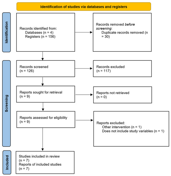 After the first search, 156 results were found in the PubMed, SciELO, WoS, and Scopus databases; 30 articles were discarded because they were duplicates, leaving 126 articles. After reading the titles and abstracts, 117 of the articles were eliminated, leaving 9, of which 2 were eliminated by inclusion and exclusion criteria for the following reasons: 1 for not addressing one of the variables and 1 for not including the intervention, leaving 7 articles selected for this systematic review (Figure 1).