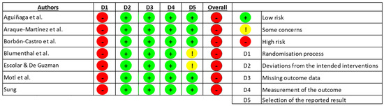 Risk of bias assessment based on the Cochrane Risk of Bias tool (Aguiñaga et al., 2018 [29]; Araque-Martínez et al., 2021 [30]; Borbón-Castro et al., 2020 [31]; Blumenthal et al., 1999 [32]; Escolar & De Guzman, 2013 [33]; Motl et al., 2005 [34]; Sung, 2009 [35]).