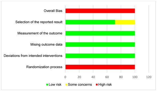 The Cochrane Risk of Bias (RoB-2) tool (ROB2_IRPG_beta_v9) [28] facilitates the evaluation of each research article through ten domains and an overall assessment, which is related to the randomization process, deviations from intended interventions, missing outcome data, outcome measurement, and selection of reported and overall outcomes. Finally, all articles are classified as having “some concerns” or a “low” or “high” risk of bias.