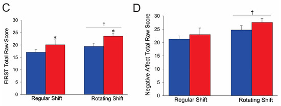 Rotating shift workers had higher SWDI scores than regular shift workers [F(1,81) = 13.316, p = 0.0005; η2 = 0.141, see †, Figure 1B], with females reporting higher SWDI scores than males regardless of shift type [F(1,81) = 4.869, p = 0.0302; η2 = 0.057; see *, Figure 1B]. Stress-induced insomnia symptoms were also higher in rotating shift workers [F(1,81) = 4.444, p = 0.0381; η2 = 0.052, see †, Figure 1C]. Females exhibited significantly higher FIRST scores than males [F(1,81) = 6.761, p = 0.0111; η2 = 0.077, see * Figure 1C]. Rotating shift workers reported significantly higher negative affect scores than regular shift workers [F(1,81) = 5.923, p = 0.0171; η2 = 0.068, see †, Figure 1D].