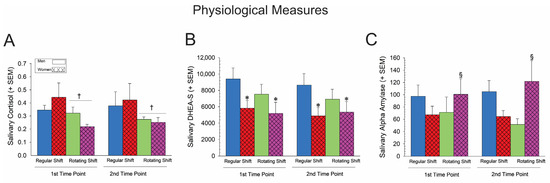Physiological measures comparing salivary levels of (A) cortisol [“n” values for each group are as follows: regular shift male (cortisol first: n = 10, cortisol second: n = 10), regular shift female (cortisol first: n = 12, cortisol second: n = 12), rotating shift male (cortisol first: n = 9, cortisol second: n = 9), and rotating shift female (cortisol first: n = 8, cortisol second: n = 8)]. (B) DHEA-S [“n” values for each group are as follows: regular shift male (DHEA-S first: n = 10, DHEA-S second: n = 10), regular shift female (DHEA-S first: n = 12, DHEA-S second: n = 12), rotating shift male (DHEA-S first: n = 9, DHEA-S second: n = 9), and rotating shift female (DHEA-S first: n = 9, DHEA-S second: n = 9)]. (C) Alpha-amylase [“n” values for each group are as follows: regular shift male (alpha-amylase first: n = 10, alpha-amylase second: n = 10), regular shift female (alpha-amylase first: n = 11, alpha-amylase second: n = 11), rotating shift male (alpha-amylase first: n = 8, alpha-amylase second: n = 8), and rotating shift female (alpha-amylase first: n = 9, alpha-amylase second: n = 9)] between regular and rotating shift workers across two time points, analyzed by two-way ANOVA. Shift work type and sex as a biological variable (SABV) are the main independent variables. ∗ denotes a main effect of sex. † denotes a main effect of shift work type. § denotes an interaction effect, indicating that female rotating shift workers significantly differ from both female regular workers and male rotating shift workers. Data are expressed as mean + SEM, by p-values < 0.05.
