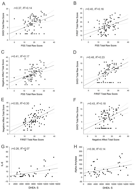 Regressions between (A) PSS Total Raw Score and SWDI Total Raw Score, (B) PSS Total Raw Score and FIRST Total Raw Score, (C) PSS Total Raw Score and Negative Affect Total Score, (D) SWDI Total Raw Score and FIRST Total Raw Score, (E) FIRST Total Raw Score and Negative Affect Total Score, and (F) SWDI Total Raw Score and Negative Affect Total Score. (G) DHEA-S and IL-6 (H) DHEA-S and alpha-amylase. Regression lines (solid) are depicted with 95% confidence intervals (dotted).