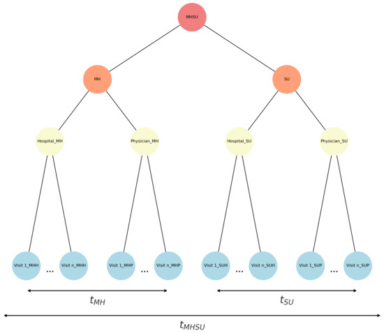 Diagram of detection of mental health (MH) status, substance use (SU) status, and their concurrent (MHSU) status in the North American healthcare administrative databases in terms of a given number of hospital visits, medical service physician visits, and time intervals within and between them.
