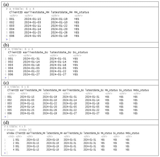 Sample simulated real world dataset: (a) Mental health status; (b) Substance use status; (c) Concurrent status (basic); (d) Concurrent status (broad).