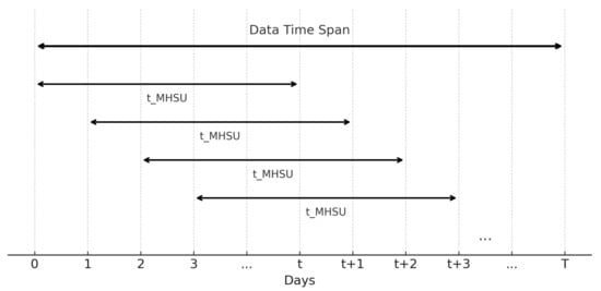 Second, for the time dimension, the function splitfunction_time(), introduced below, takes the dataset inputdata (with time span T days) and an integer as input. It then partitions the dataset into l subsets, where The first subsets each are in the time span of t days, while the lth subset time span is at most t. For example, we consider the case where and :