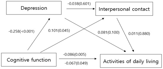 Table 3 and Figure 1 show that each model was partially significant. In step 1, cognitive function significantly affected ADL (B = −0.086, p = 0.005), and in step 2, cognitive function significantly affected depression (B = −0.258, p = 0.001). In step 3, cognitive function (B = 0.101, p = 0.045) significantly affected interpersonal contact, but depression (B = −0.038, p = 0.601) was not significant. In step 4, cognitive function (B = −0.067, p = 0.049) exhibited a significant effect on ADL, but depression (B = 0.081, p = 0.100) and interpersonal contact (B = 0.011, p = 0.880) were not significant.