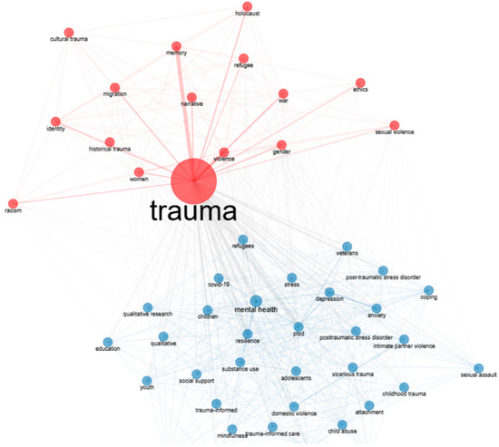 Throughout their lives, individuals encounter various man-made and natural conditions that lead to stress, whose intensity and occurrence are steadily rising over time [1]. This growing threat is evident from the large volume of documents and heightened research interest. For example, stress and stress-related trauma have become a focal point for researchers over the past decade, accounting for 66.33% (20,590 out of 31,040) of publications in the SCOPUS database (as of June 4, 2024). To reveal the core content of these studies, we constructed a co-occurrence network (Figure 1), which highlights prominent trauma-related topics such as cultural trauma [2], holocaust [3], migration [4], refugee [5], identity [6], historical trauma [7], racism [8], narrative [9], violence and sexual violence [10], war [11], and ethics [12]. These topics are often associated with diverse physiological and biochemical disturbances [13]. Stress, depression, resilience, substance use, and mental health are key parameters discussed, with adolescents, children, and youth being major focus groups. While trauma linked to natural disasters is less thematically represented, some reports address this topic, particularly earthquakes [14,15].