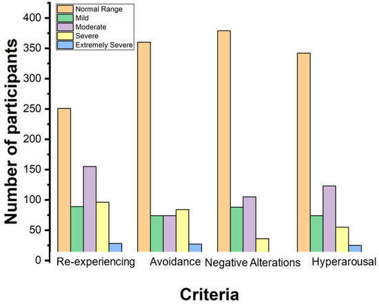 The PCL-5 aggregates item scores to provide a continuous measure of PTSD symptom severity, encompassing symptom clusters and the disorder as a whole, akin to the PCL. These clusters include the re-experiencing (Criterion B) assessed by questions 1–5, each rated on a 4-point scale representing a total of 20 points. Avoidance behaviors (Criterion C) are measured by questions 6 and 7, totalling 8 points. Negative alterations in cognition and mood (Criterion D) are represented by 28 points, while hyperarousal (Criterion E) is defined by a total of 24 points. If the total score from this assessment exceeds 33, it indicates a clinical case necessitating treatment. Additionally, classifications based on the mean scores for each criterion are as follows: normal (x̄ ≥ 1.23), mild (1.23 < x̄ ≤ 1.64), moderate (1.64 < x̄ ≤ 2.455), severe (2.455 < x̄ ≤ 3.265), and extremely severe (x̄ > 3.265) (Table 3). These cutoff values were based on empirical scoring recommendations used in clinical research applying the PCL-5, including those by Weathers et al. (2018) [34], Bovin et al. (2016) [46], and Wortmann et al. (2016) [47], who suggested symptom severity classifications to support non-diagnostic interpretation and clinical screening in post-disaster settings. In this study, conducted with 619 participants, it was found that 191 participants scored 33 or higher, corresponding to 30.86% of the participants, indicating clinically significant PTSD symptoms (Figure 2). Among this group, 22 participants experienced symptoms at severe to extremely severe levels, while 19 participants exhibited extremely severe symptoms in at least one subscale. Additionally, three participants reported extremely severe symptoms across all four subscales, and nine participants showed extremely severe symptoms in three subscales.
