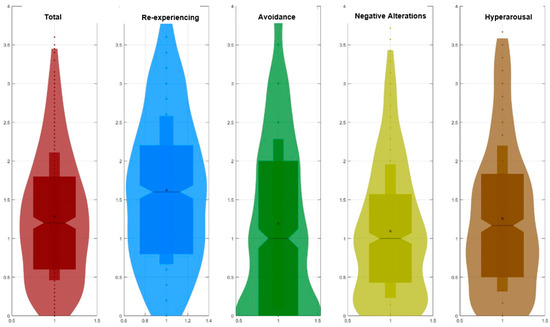 Considering the representation of the criteria with a violin plot (Figure 3), the average responses of participants to the questions (1–5) prepared for re-experiencing symptoms are in the moderate range, and the corresponding violin graphs show a more normal distribution compared to other criteria. A majority of participants (>75%) responded with scores between 0 and 2 for avoidance symptoms, and the averages show a significant increase up to level 4. In the category of negative alterations, 75% of participants scored below 1.6, with an average of 1.1, indicating a decrease in the number of individuals at risk for PTSD. For hyperarousal symptoms, the average is around 1.3, with 75% of participants scoring below the 1.8 average, and it is notably observed at the extremely severe level. These data help us understand the distribution and intensity of the symptoms.