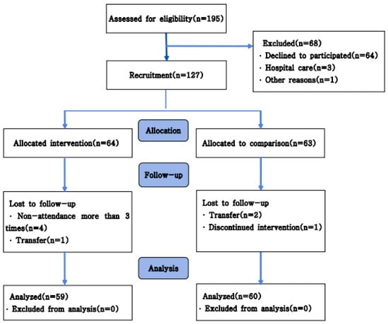 A cyberbullying victimization survey was conducted among 573 fifth- and sixth-grade students at an elementary school in Asan City. From this group, 195 children were selected based on their responses to eight questions addressing their experiences with cyberbullying. These questions measured the frequency of victimization, with the following options: (1) at least once or twice every six months in the past year, (2) once or twice a month, (3) once or twice a week, and (4) once or twice almost every day. Based on the work of Kowalski et al. [] the victims were identified based on their frequency of victimization, as cyberbullying typically does not occur as a single event; instead, it often involves the ongoing sharing and disseminating of harmful photos, comments, and content. The inclusion criteria required that children had experienced cyberbullying within the past year, as determined through a questionnaire. Participants were limited to those who voluntarily agreed to be involved in the study and who had obtained parental consent. Of the 195 children, 68 were excluded due to refusal to participate in the program (n = 64), hospital care (n = 3), and other reasons (n = 1). Consequently, 127 children received the intervention and were evaluated in this study. They were diagnosed and assessed by a pediatric psychiatrist according to the DSM-5 criteria, ensuring that none had developmental disorders such as childhood psychosis, autism, or intellectual disabilities, nor were they taking any medications. Among them, 64 students were randomized to the GST intervention group, while 63 were assigned to the control group. There was no psychiatric disorder in either the intervention or control group.