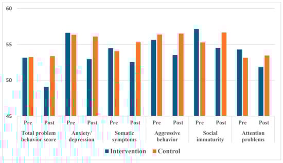 Graphs of means differences in total problem behavior score, anxiety/depression, somatic symptoms, aggressive behavior, social immaturity, attention problems.